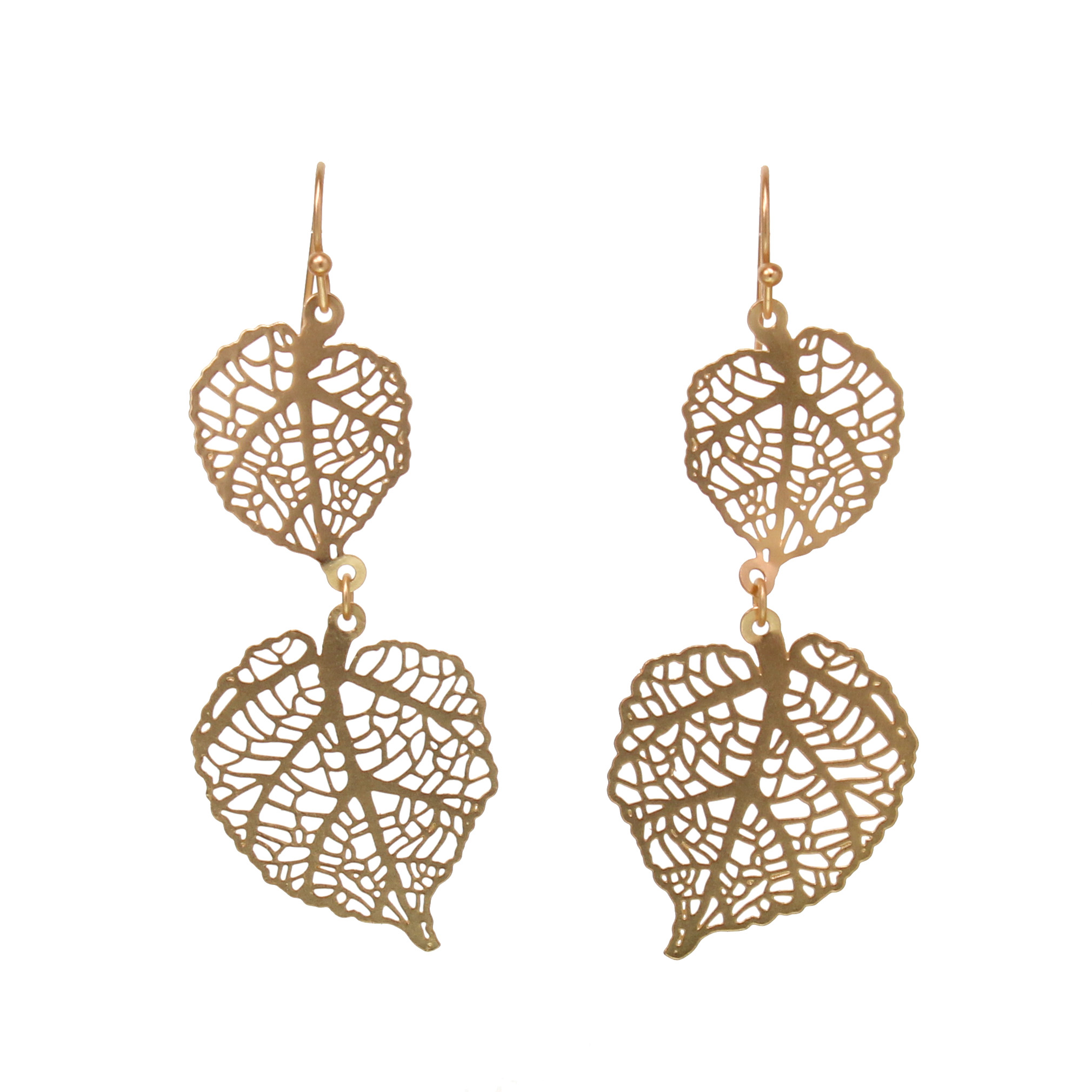 Double Leaf Brass Filigree Earring with Matte Gold Finish, 2 1/4″