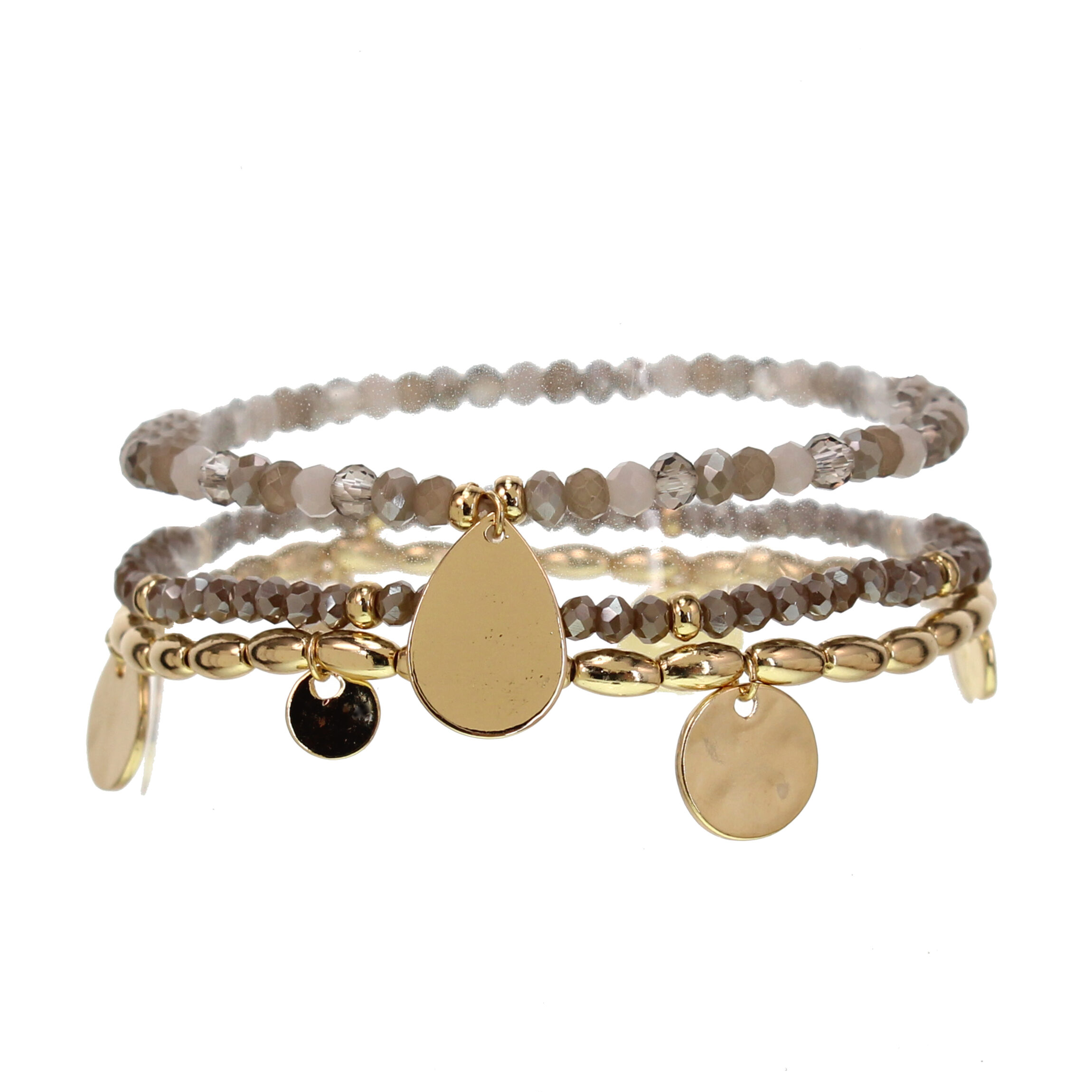 Triple Stretch Bracelet Set with Champagne Crystal and Gold Plated Beads with Disc Charms, O/S