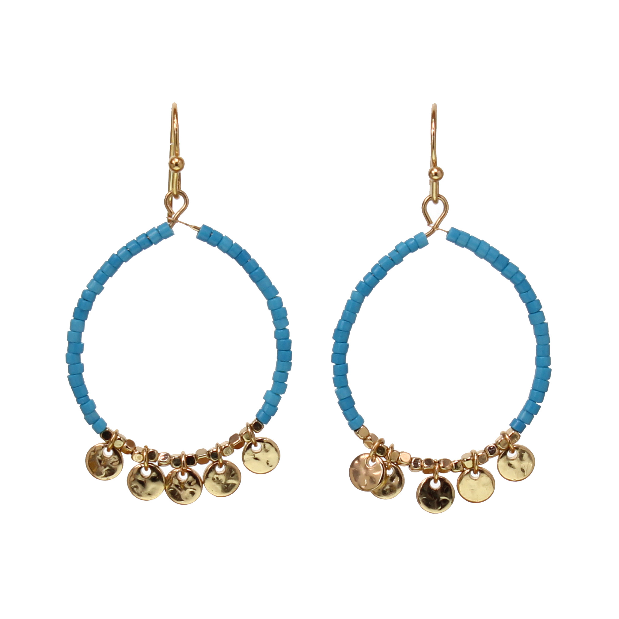 Bright Gold and Turquoise Miyuki Seed Bead Gypsy Hoop Earring, 1 3/4″