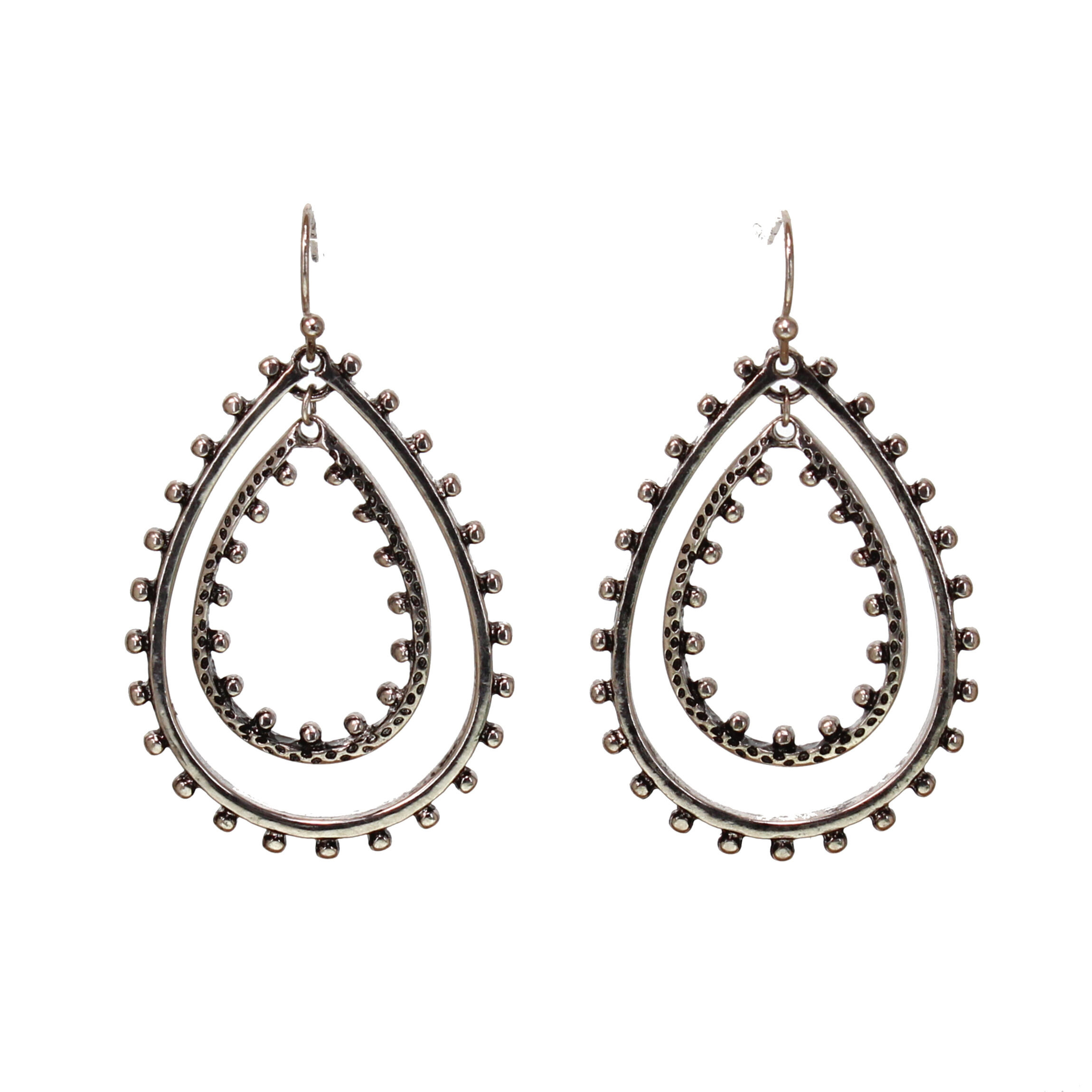 Antique Silver Plated Double “Bali” Teardrop Hoop Earring, 2″