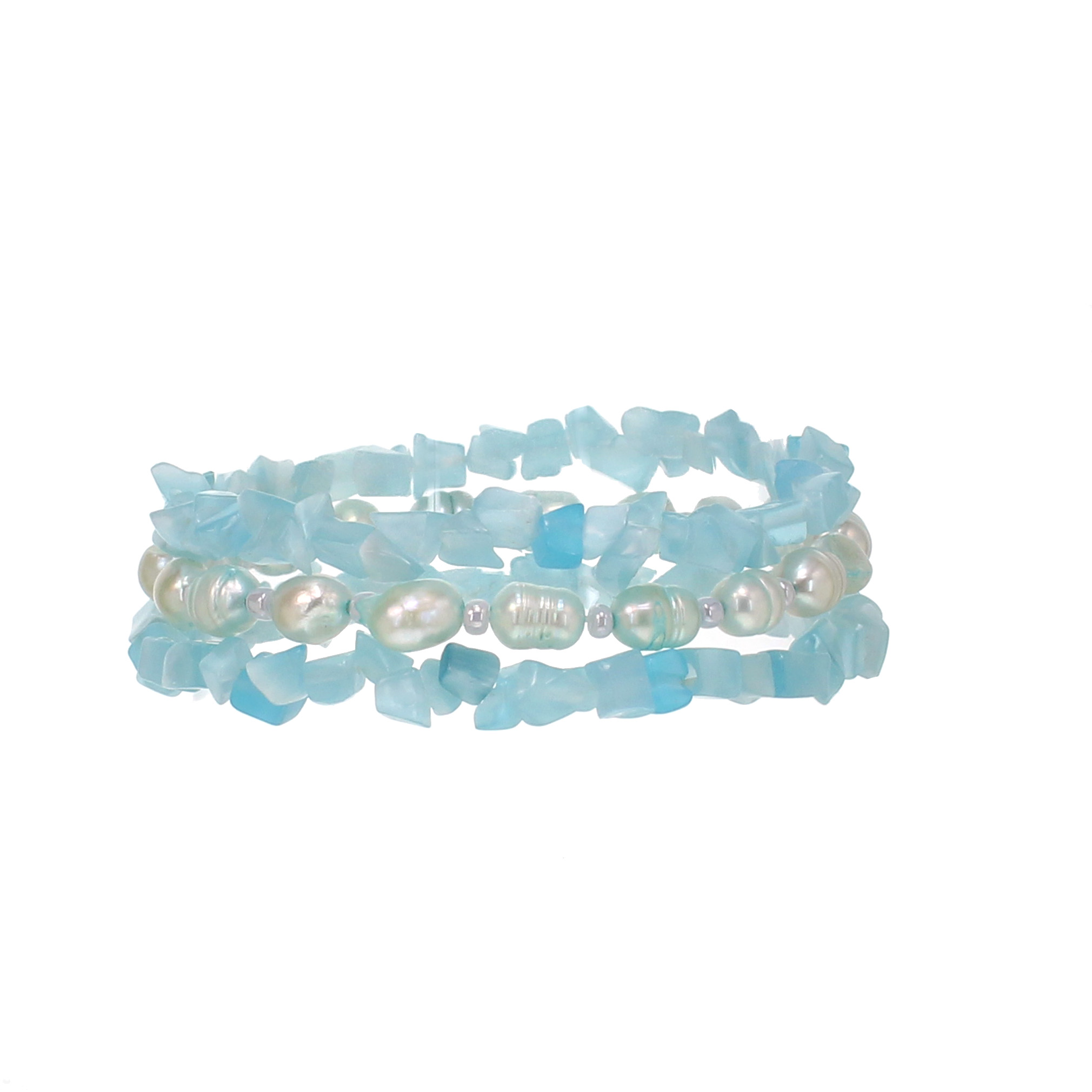 Baby Blue Fresh Water Pearl and Fiber Optic Quartz 3 Piece Stretch Bracelet, O/S
