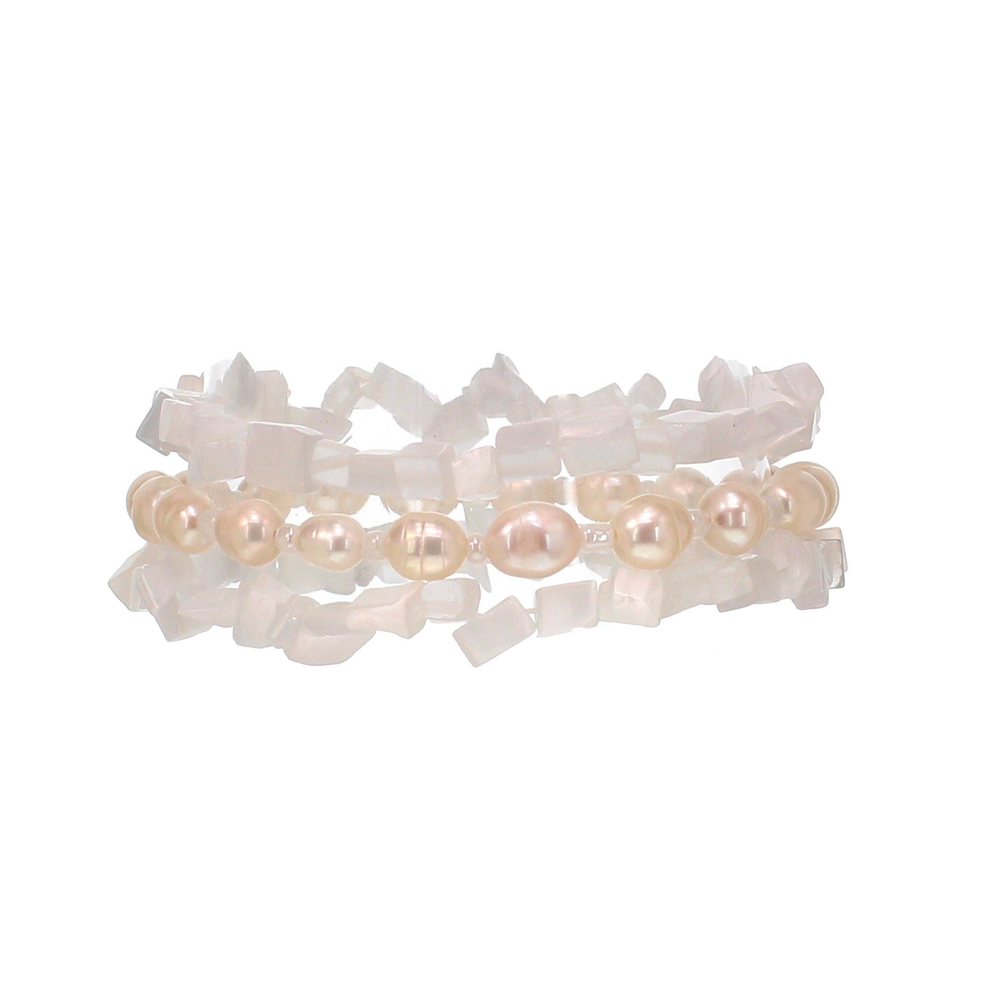 White Fresh Water Pearl and Fiber Optic Quartz 3 Piece Stretch Bracelet, O/S